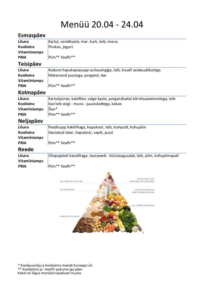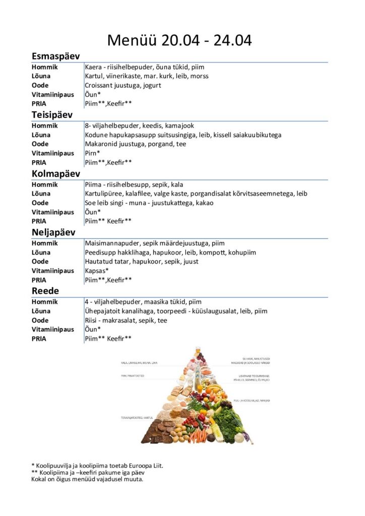 Koolisöökla menüü lasteaiale ja koolile